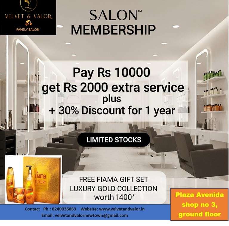 Rejuvenate your skin and soul with our luxurious beauty treatments at Velvet & Valor Family Salon, New Town. We offer a premium range of facials and skin therapies using renowned skincare brands like O3+, Casmara, Jennaut, Lotus Herbals, and Shahnaz Husain β each known for their high-quality, skin-loving formulas.
