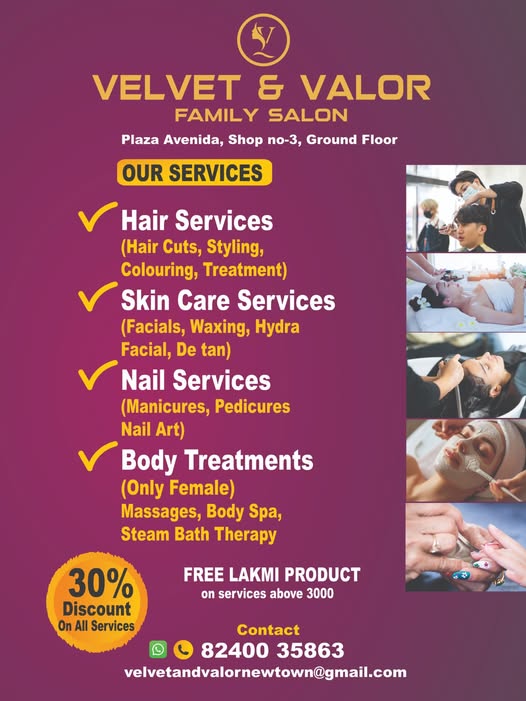 Heres a sincere wonderful review for VELVET AND VALOR. My kids (5yrs) are extremely choosy about their hair dresser ( in fact everything😅)..... they were very cranky wen we took them to this new place. But mr Shontu and Ms Chandni were so efficient in handling them,, they got lovely hair cut n styling done. We elders had few hair dos as well. Very ultra modern facilities, shampoo unit very comfy and i was pleased to see a wonderful makeup unit too😜.....the spa n facial units are very cosy too. Nail art and piercing facilities are also der.